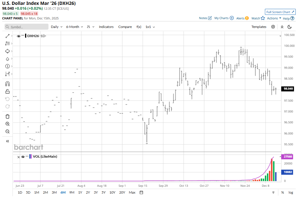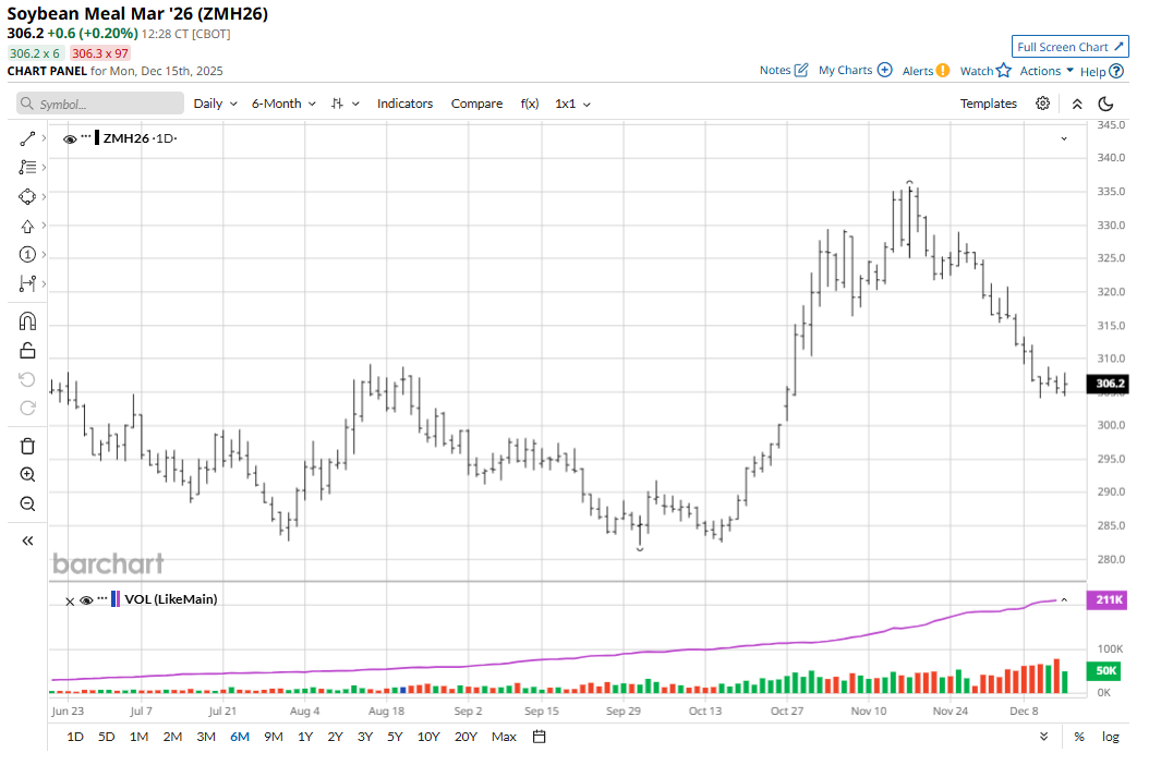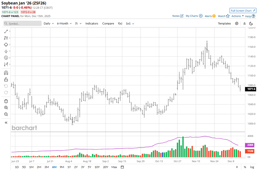 March corn (ZCH26) futures hit a two-week low on Friday and fell 5 3/4 cents to $4.40 3/4, and on the week dropped 4 cents. January soybeans (ZSF26) on Friday fell 16 3/4 cents to $10.76 3/4, hit a six-week low, and for the week were down 29 1/4 cents. March soft red winter wheat (ZWH26) fell 4 1/4 cents to $5.29 1/4 and closed at a six-week-low close. For the week, March SRW was down 7 1/4 cents. March hard red winter wheat (KEH26) on Friday fell 4 1/4 cents to $5.18, hit a six-week low, and lost 13 1/4 cents on the week. Importantly, all the above markets on Friday closed at technically bearish weekly low closes, suggesting the speculative, chart-based bears have a head of steam early this week to continue to more aggressively play the short sides of the grain markets.
