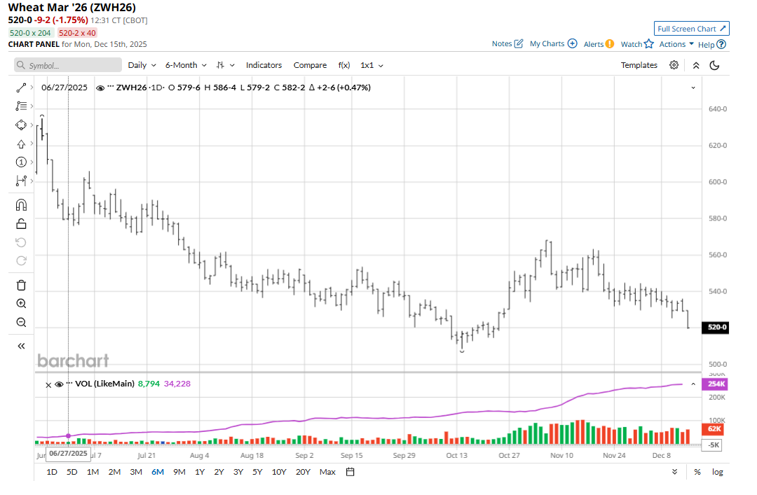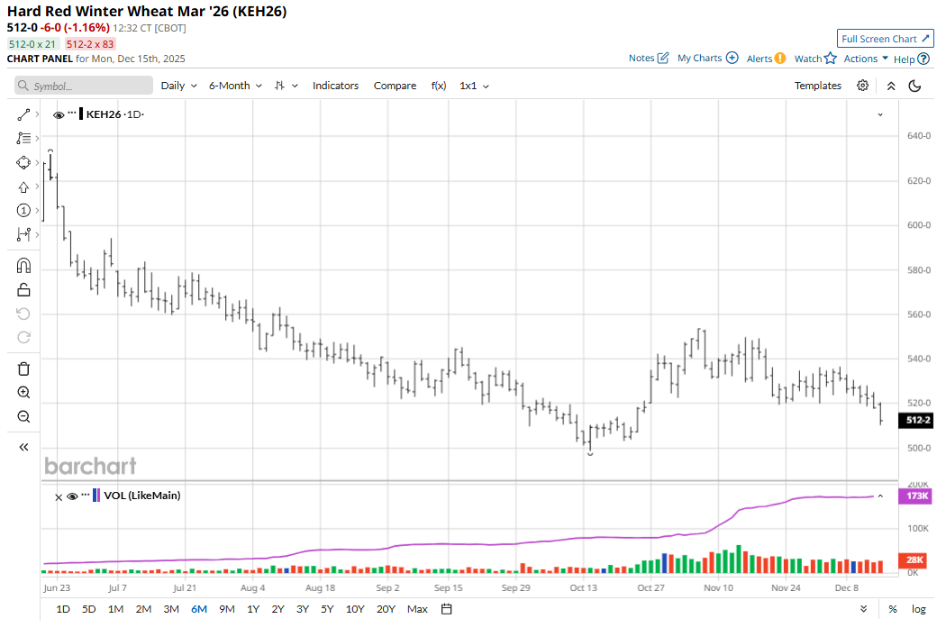 The winter wheat futures markets remain trapped in price downtrends on the daily bar charts. Ample global supplies continue to hang over the wheat markets. Argentina’s Rosario exchange late last week raised its 2025-26 wheat production estimate by 2.2 million metric tons (MMT), to a record 27.7 MMT. The Buenos Aires Grain Exchange estimates Argentine wheat production at 25.5 MMT, while USDA’s latest estimate is 24 MMT. Russia’s seaborne grain exports rose in November for the first time this season to 6.0 MMT, up 26.6% from the same month a year-ago, according to shipping data from industry sources.