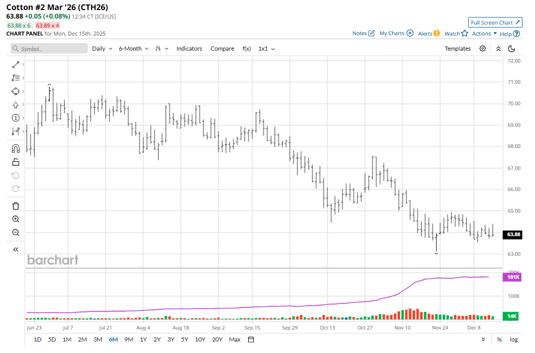 March cotton (CTH26) futures on Friday fell 14 points to 63.83 cents and for the week lost 10 points. Cotton’s solidly bearish near-term technical posture continues to limit buying interest from the speculators. Cotton traders will look to the grain futures markets for price direction this week. And the grain futures markets are looking very heavy at present.