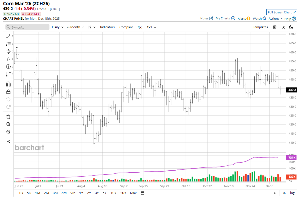 March corn futures remain in the middle of a choppy and sideways trading range, but Friday’s price action gave the bears momentum. Bulls got no help from the USDA reporting daily U.S. corn sales of 250,000 MT of corn to unknown destinations during 2025-26 on Friday. Export demand for U.S. corn has been good. USDA in last week’s supply and demand report (WASDE) gave a 125-million-bushel boost to U.S. corn exports for the 2025-26 marketing year. While corn futures prices have languished the past few weeks, the hefty U.S. corn sales abroad should keep a floor under futures prices.