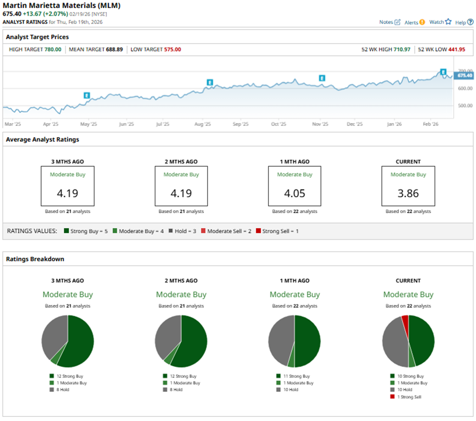 On Feb. 17, Morgan Stanley analyst Angel Castillo raised the price target on Martin Marietta Materials to $706 while maintaining an “Overweight” rating.