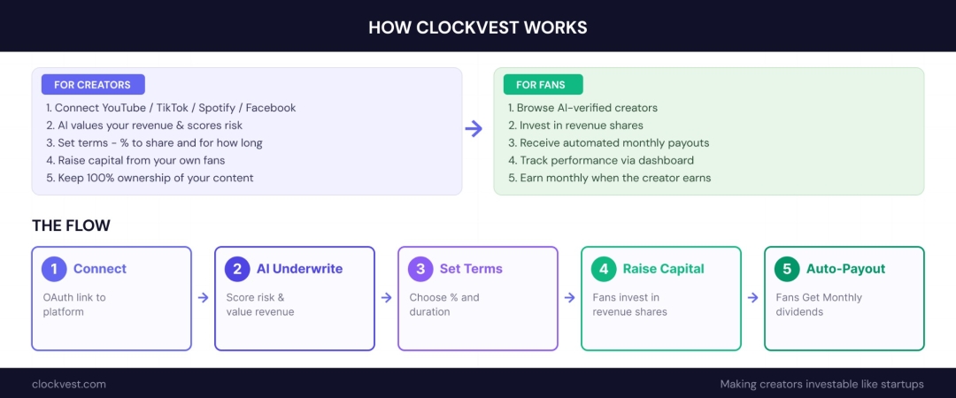 Clockvest occupies the intersection: creator economy scale, revenue-based financing mechanics, and a compliance-first operating model.