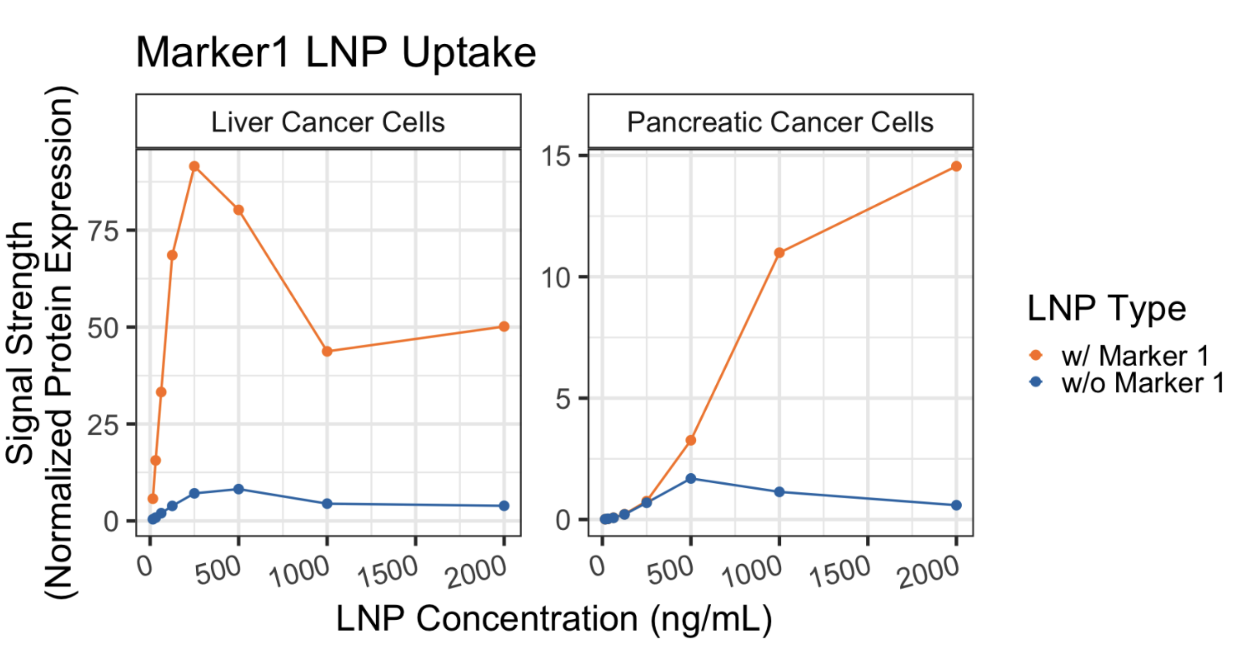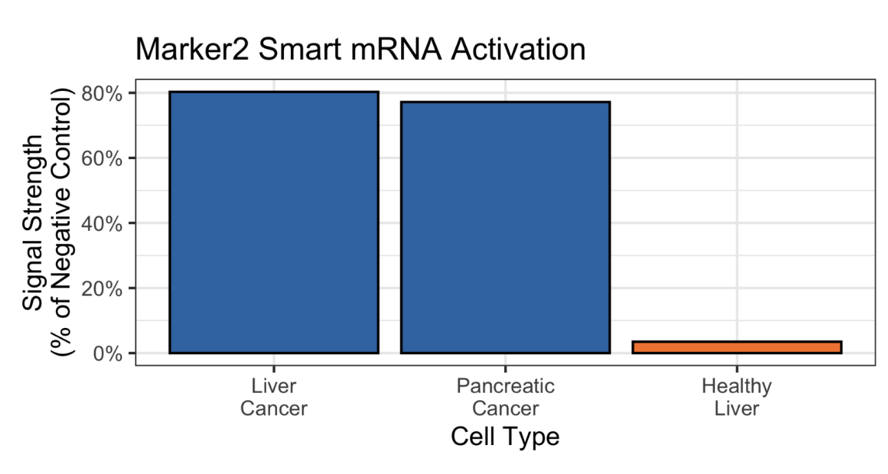 In recent in-vitro studies using pancreatic and liver cancer cell lines, the Company received two compelling results that provided confidence in moving forward with animal studies using tumor bearing mice. The first was that the Marker1 LNPs were absorbed into cancer cells with high efficiency. The second was that Marker2 Smart mRNAs were strongly activated in cancer cells and strongly deactivated in healthy human liver cells.