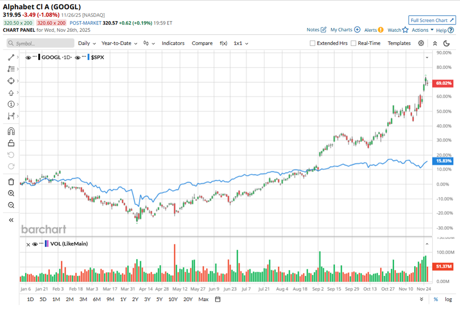 The stock has been nothing short of unstoppable, soaring nearly 68% so far in 2025 and an incredible 84.8% over the past six months. For comparison, the broader S&P 500 Index ($SPX) has climbed a far more modest 16.3% this year and 15.72% over that same six-month stretch, making Google’s surge look all the more impressive.