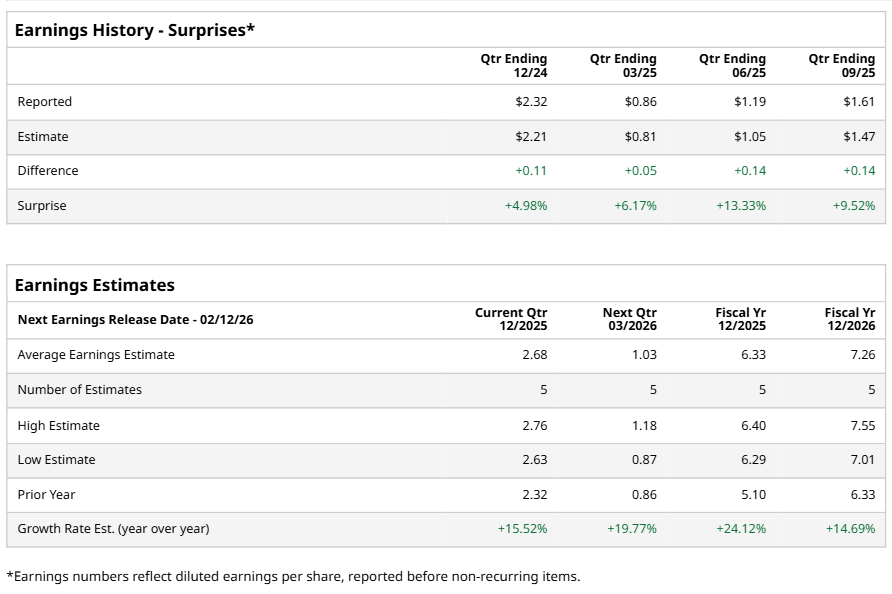 Dallas, Texas-based CBRE Group, Inc. (CBRE) operates as a commercial real estate services and investment company. Valued at $49 billion by market cap, the company offers property management, valuation, real estate investment, and advisory services. CBRE operates offices, data centers, multi-family, hotels, gaming, and retail sectors. The world’s largest commercial real estate services and investment firm is expected to announce its fiscal fourth-quarter earnings for 2025 before the market opens on Thursday, Feb. 12.