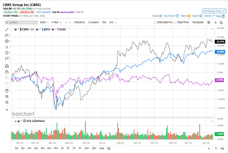 CBRE stock has outperformed the S&P 500 Index’s ($SPX) 18.6% gains over the past 52 weeks, with shares up 32% during this period. Similarly, it outperformed the Real Estate Select Sector SPDR Fund’s (XLRE) 3.4% gains over the same time frame.