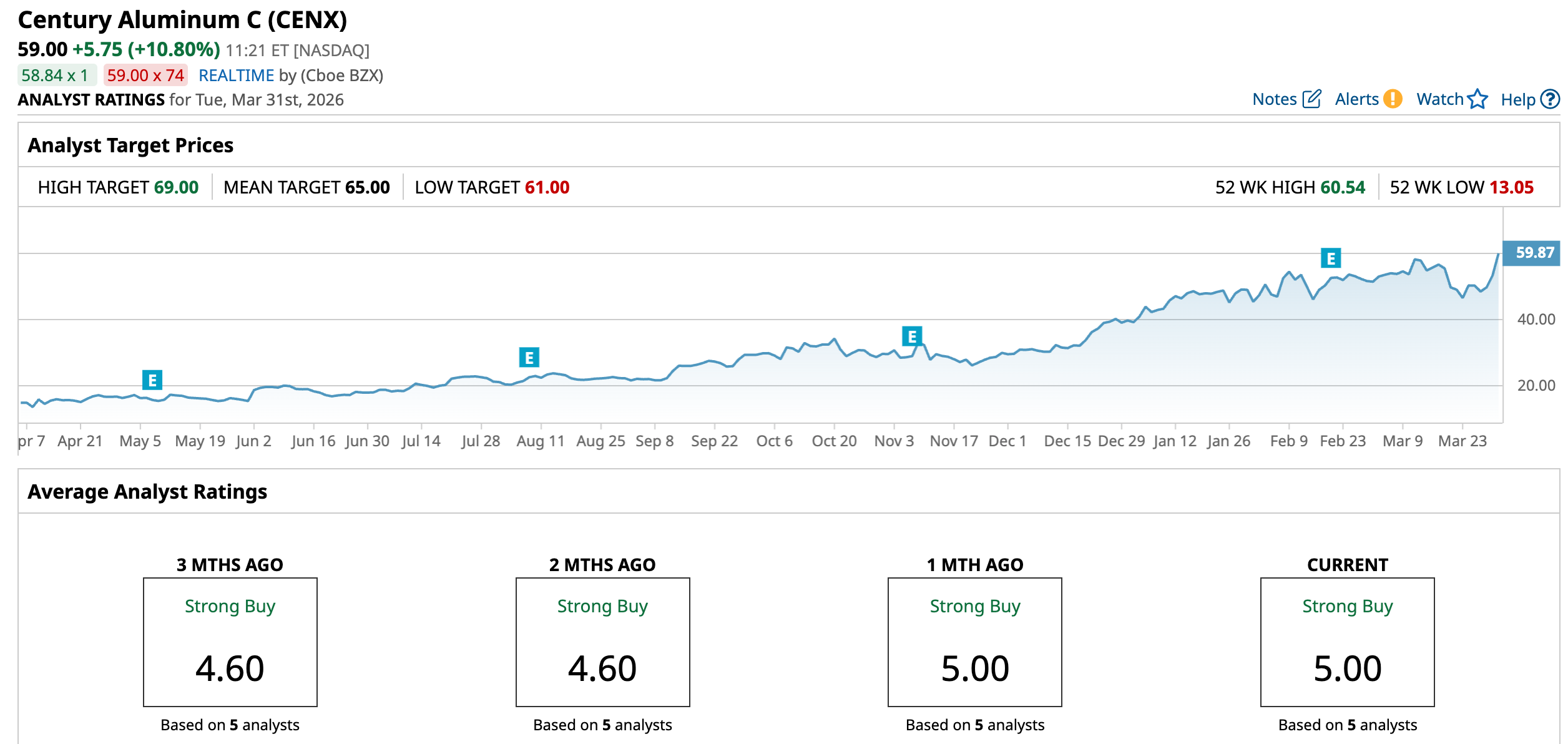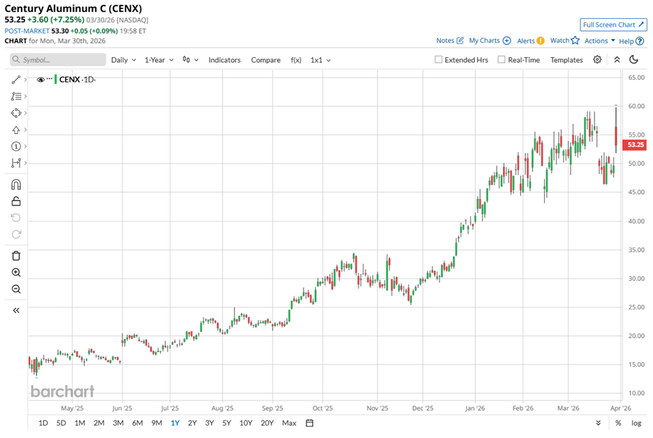CENX stock has gained 53.14% in 2026, comfortably outpacing Alcoa Corporation (AA), which remains the industry’s most recognized name by market cap. On March 30 alone, Century Aluminum’s shares rose 7.3%, taking its past five trading days' advance to 18.12%.