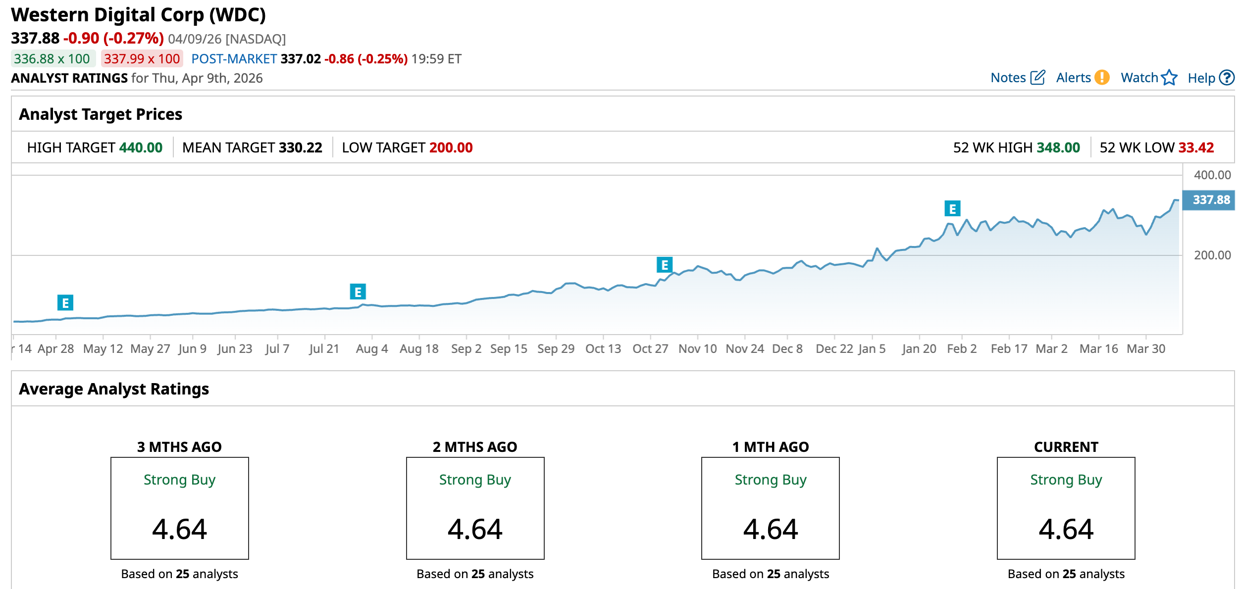 Western Digital has become a popular name on Wall Street, with analysts awarding it a consensus “Strong Buy” rating overall. Of the 25 analysts rating the stock, a majority of 20 analysts have given it a “Strong Buy” rating, one analyst rated it “Moderate Buy,” while four analysts are taking the middle-of-the-road approach with a “Hold” rating. The consensus price target of $330.22 represents a 2.27% downside from current levels. However, the Street-high price target of $440 indicates a 30.2% upside.