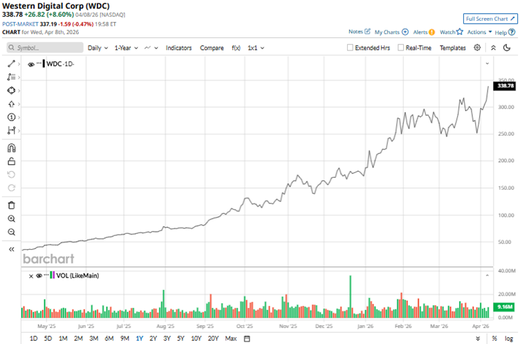 Data centers building AI infrastructure need enormous amounts of storage to train models. This creates a significant tailwind for Western Digital, making the stock look like a pure-play on AI infrastructure. This has also led the company’s share price to skyrocket. Over the past 52 weeks, the stock gained 830.8%, while it is up 96.13% year-to-date (YTD). It reached a 52-week high of $348 on Apr. 8 and is only down modestly from that level.