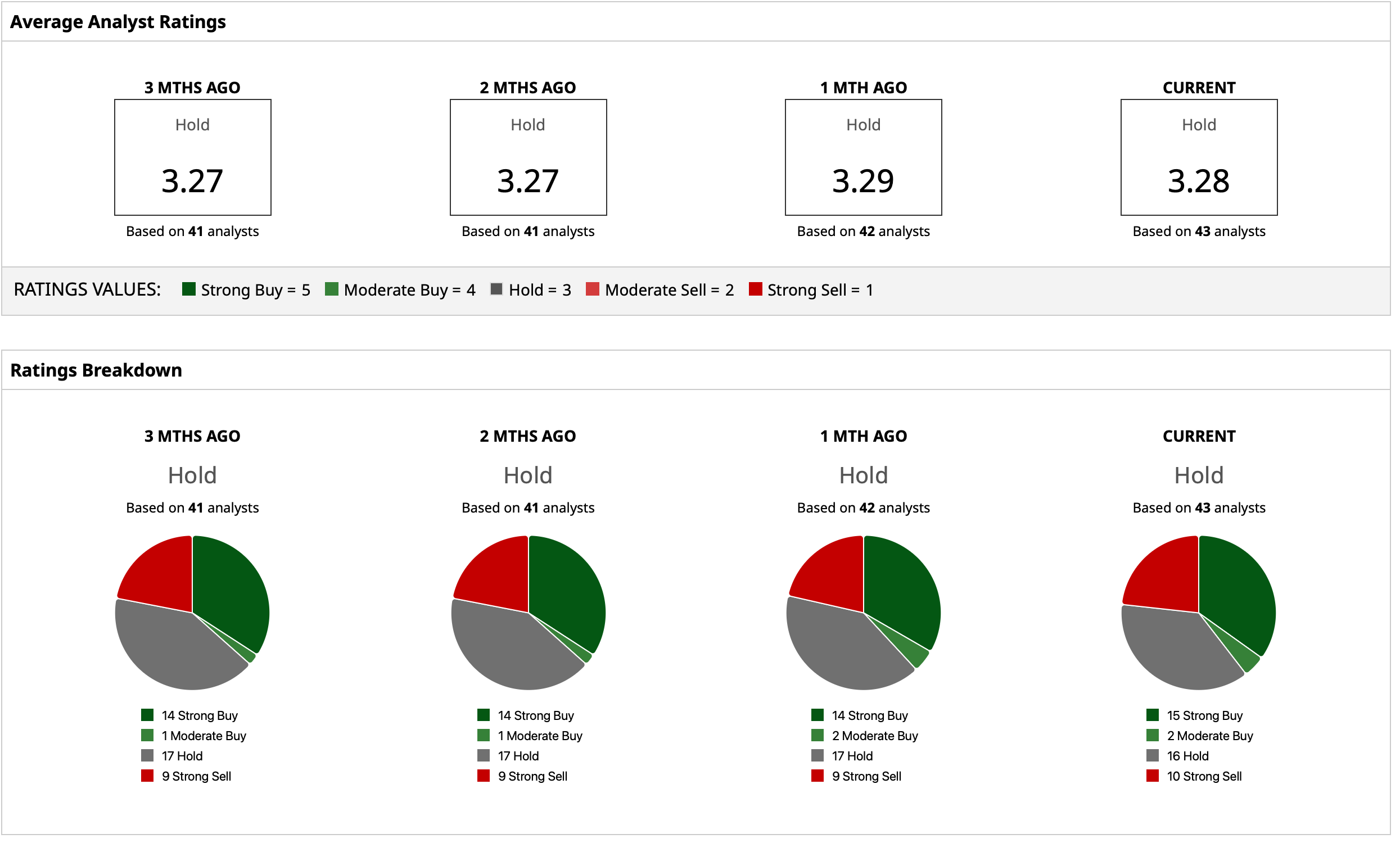 Overall, analysts have attributed a rating of “Hold” for TSLA stock, with a mean target price of $405.64. This denotes an upside potential of about 10% from current levels. Out of 43 analysts covering the stock, 15 have a “Strong Buy” rating, two have a “Moderate Buy” rating, 16 have a “Hold” rating, and 10 have a “Strong Sell” rating.