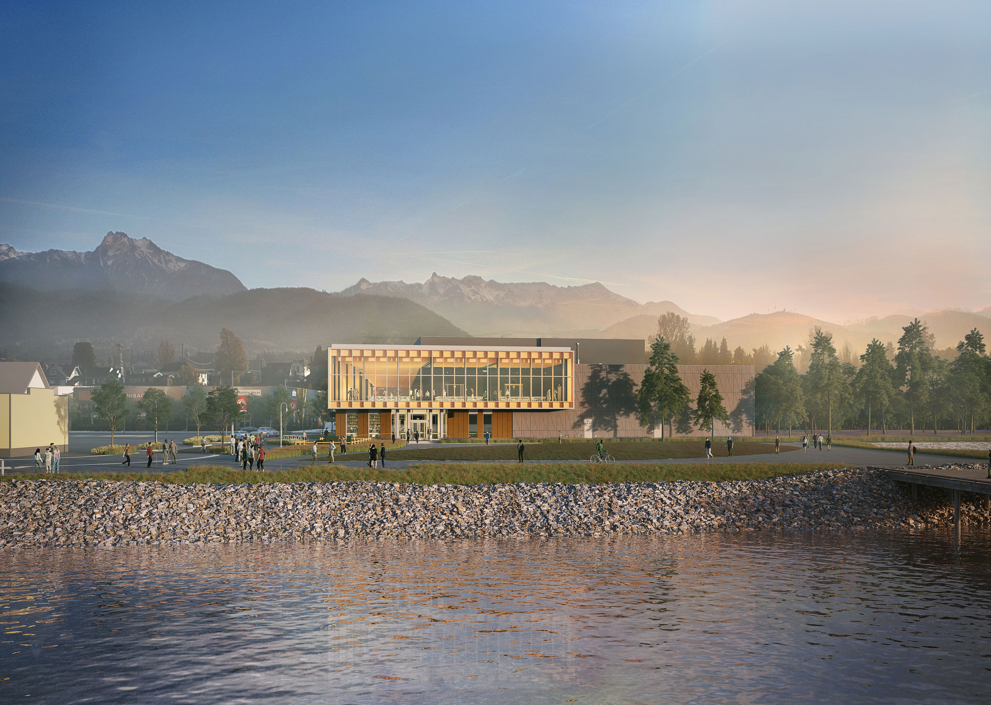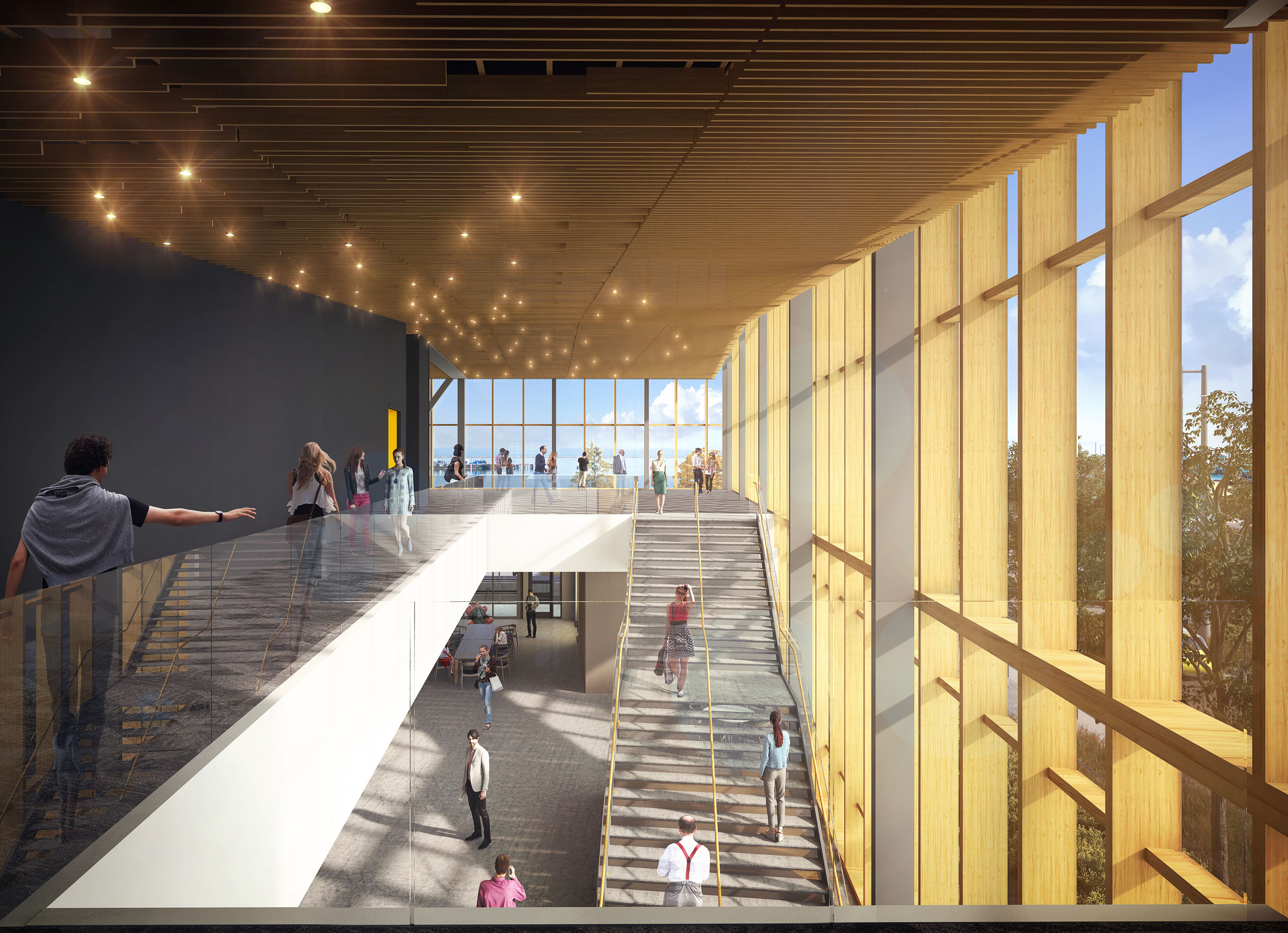 Port Angeles’ history and ecosystem is celebrated in the aesthetics of the building, giving users a chance to engage with the town’s unique culture and geography while the spectacular natural environment is captured within the architectural gestures of the building. Visitors arrive at a street level urban entry and progress up a feature stair to be met with panoramic views of the Olympic Mountains and Strait of Juan de Fuca. Port Angeles’ timber history is represented through the use of wood and natural materials throughout the building. A curtain wall constructed of regionally sourced timber mullions offers 270-degree wrap-around views in the multi-level lobby and conference space. The wooden lobby ceiling gives warmth to the public spaces with integrated lighting that mimics sunlight reflecting off the water.