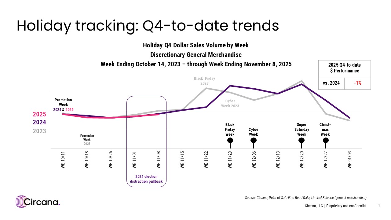 Declines in discretionary spending and unit demand as the holiday shopping season gets underway are an indication of the current consumer volatility, particularly up against last year’s early season declines. To date, through the week ending Nov. 8, fourth-quarter 2025 sales revenue of discretionary general merchandise is down 1% from this time last year, and unit demand is down 3%. Compared to two years ago, discretionary general merchandise sales for this period are down 10% in dollars and 9% in units.