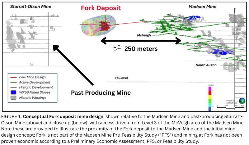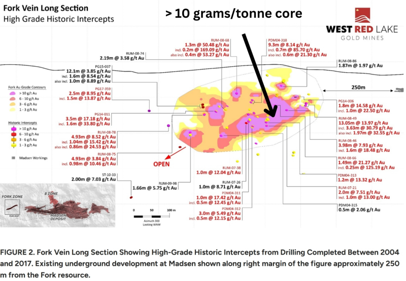 “The shallow nature of the deposit will allow for efficient definition drilling from surface. With its high grades and proximity to existing underground development, it is easy to envision this core zone of Fork becoming part of the production pipeline at Madsen, based on successful infill drilling results.”