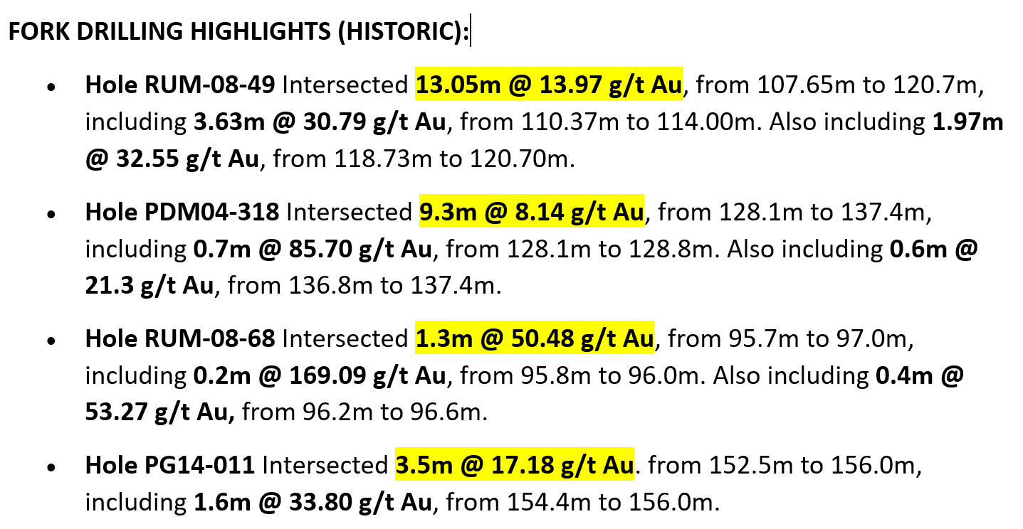 The Fork Deposit contains an Indicated mineral resource of 20,900 ounces @ 5.3 grams per tonne gold, with an additional Inferred resource of 49,500 oz grading 5.2 g/t gold.