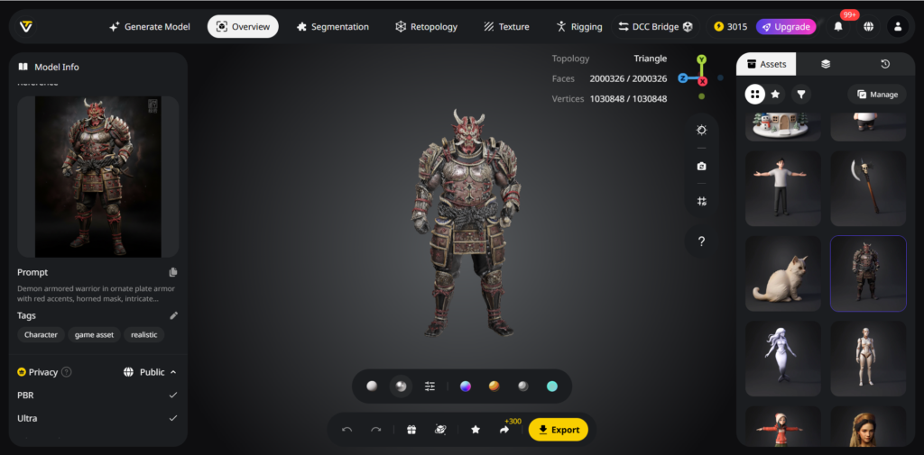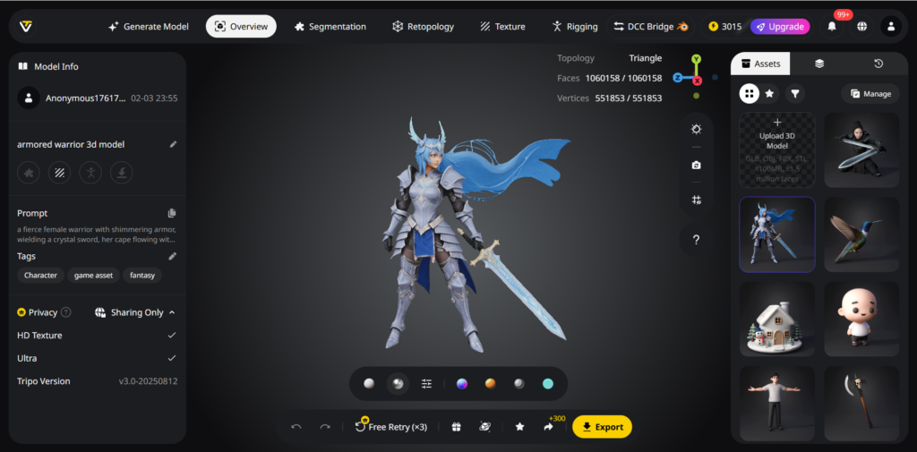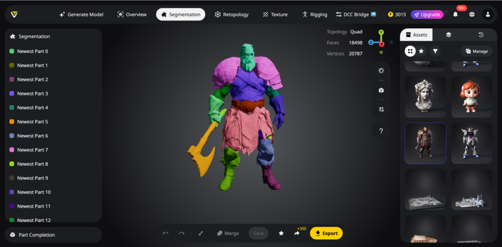 Tripo’s intelligent segmentation feature allows a generated model to be split into editable parts. Each segment can be modified independently, making it easier to adjust proportions, replace elements, or refine specific areas.