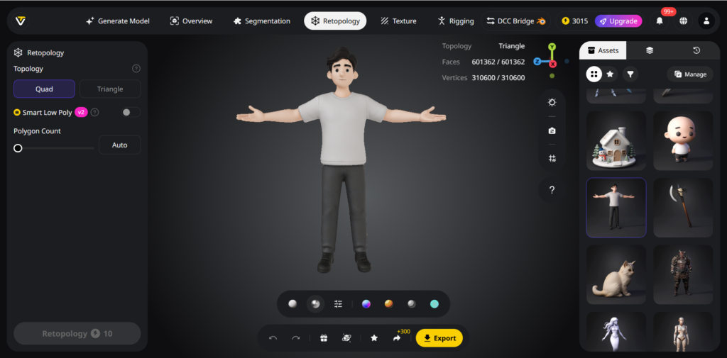 Quad topology is generally better suited for animation and detailed editing, while triangle topology preserves surface detail and is often preferred for static assets. Tripo also offers a Smart Low Poly option, creating simplified meshes that are easier to edit and optimize.