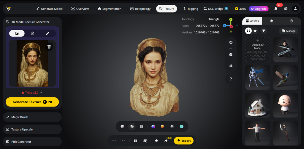 The AI texturing module integrates texture generation, editing, upscaling, and PBR workflows into a single system. Users can upload reference images or describe surface qualities in text to guide the look of materials.