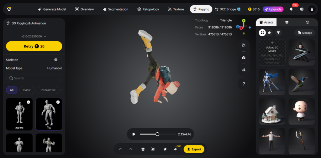 Rigging is often a time-consuming step in character creation. Tripo’s auto-rigging feature automatically prepares models with skeletal structures and generates ready-to-use animations.